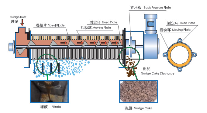 叠螺式污泥脱水机集全自动控制柜、絮凝调质槽、污泥浓缩脱水本体及集液槽于一体,可在全自动运行的条件下,实现高效絮凝,并连续完成污泥浓缩和压榨脱水工作,最终将收集的滤液回流或排放。